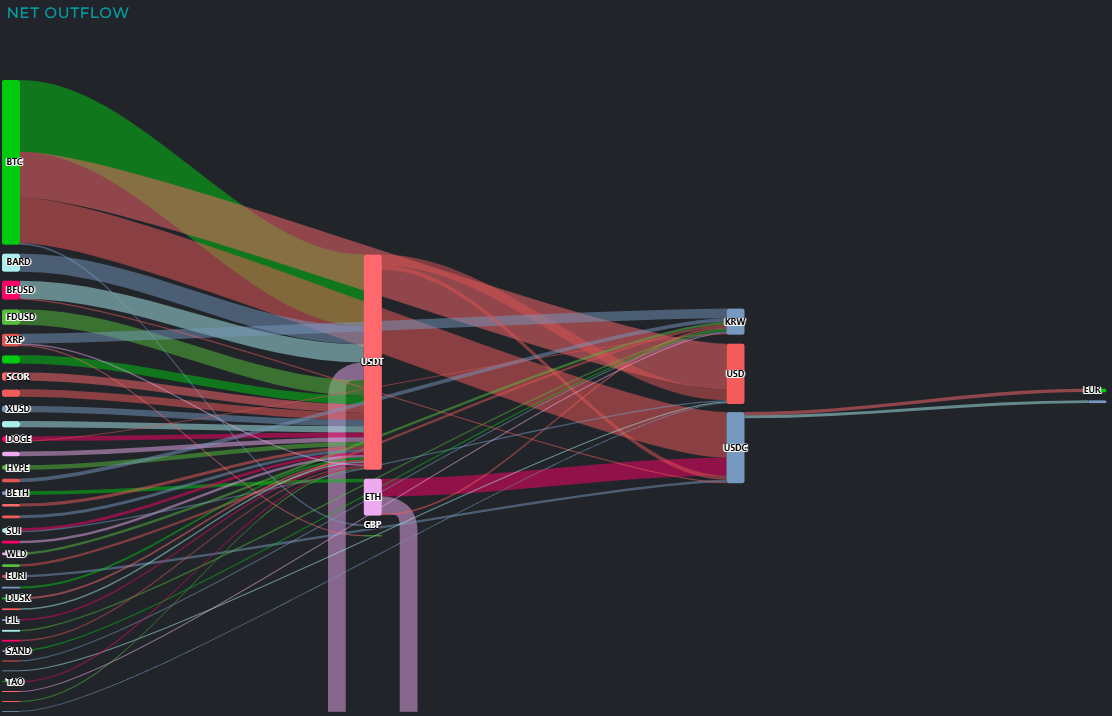 자금 유출 흐름을 보면 비트코인(BTC)에서 총 1억3010만 달러 규모의 유출이 발생했다. 이 가운데 5590만 달러가 USDT로 이동했고, 3730만 달러는 달러화(USD), 3580만 달러는 USDC로 전환됐다.