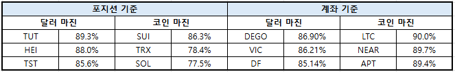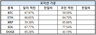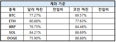 솔라나(SOL)는 달러 마진 84.21%, 코인 마진 86.69%였으며, 도지코인(DOGE)은 달러 마진 75.90%, 코인 마진 88.88%로 집계됐다.