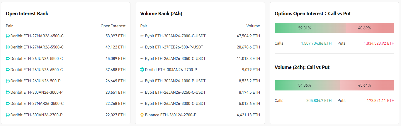 24시간 거래량 기준 상위 계약은 ▲7000달러 콜옵션(2026년 1월 30일·바이비트) ▲500달러 풋옵션(2026년 2월 27일·바이비트) ▲3350달러 콜옵션(2026년 1월 26일·바이비트) 순으로 나타났다.