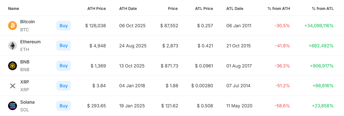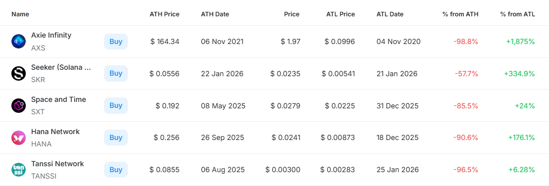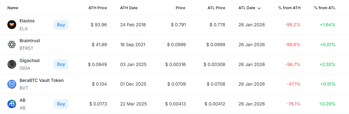 [편집자주] 암호화폐 시장은 하루 새 고점과 저점이 빠르게 바뀌는 고변동성 환경이다. 역대 최고가(ATH)와 역대 최저가(ATL) 경신 종목을 추적하면 강세와 약세 흐름을 조기에 포착할 수 있다. 크립토랭크 기준 시가총액 1000만 달러 이상 종목 중 하루 사이 고점 또는 저점을 경신한 주요 토큰을 정리하고 시가총액 상위 종목과 실시간 국내 인기 자산의 고점 대비 조정률을 함께 분석해 시장 회복 여력과 흐름을 진단한다.