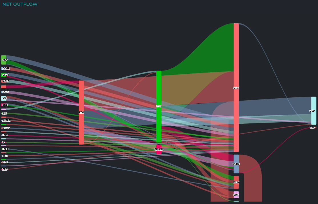 XRP에서는 4280만 달러 규모의 유출이 집계됐다. 이 가운데 USDT로 2170만 달러, 원화(KRW)로 1790만 달러가 이동하며 법정화폐 환전 비중이 상대적으로 높게 나타났다. DOGE에서는 1510만 달러가 USDT로 이동했다.