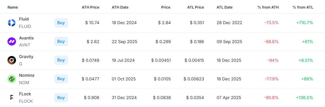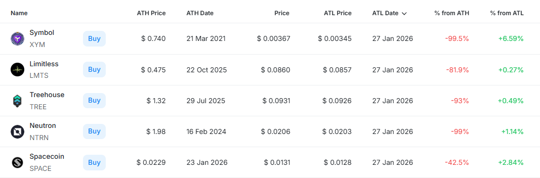 이번 집계에서는 총 15개 종목이 신저점(ATL)을 기록했다. 위 5개 종목은 신저점 직후 소폭 반등한 흐름이 포착됐다. 공통적으로 과거 고점 대비 낙폭이 매우 큰 종목들이며 유동성 축소 국면에서 매도 압력이 누적된 이후 기술적 반등이 나타난 사례로 해석된다. 다만 ATL 대비 반등률은 전반적으로 제한적인 수준에 그치고 있다.