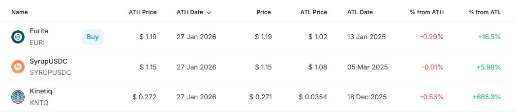 3개 종목이 신고점을 경신했다. 공통적으로 가격 변동 폭은 크지 않지만, 상대적으로 저변동·안정형 자산 또는 유동성이 얕은 종목에서 신고점이 형성됐다.