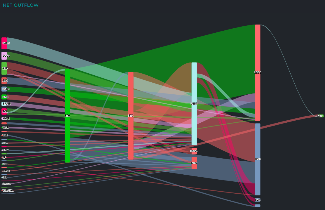 유출 자금의 최종 안착 자산을 보면 USDC가 1억3390만 달러로 가장 큰 유입을 기록했다. 달러화(USD)는 총 1억130만 달러, 원화(KRW)는 1680만 달러, FDUSD는 920만 달러가 각각 안착했다. 유로화(EUR)와 파운드화(GBP)에는 각각 530만 달러, 410만 달러가 유입됐다.