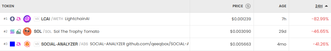 반면 가장 크게 하락한 거래쌍은 LCAI/WETH(LightchainAI)로 24시간 기준 -82.99%를 기록했다. SOL/SOL(Sol The Trophy Tomato) 역시 -46.65% 하락했고, SOCIAL-ANALYZER/ADS(SOCIAL-ANALYZER)는 -41.26%로 약세를 보였다.