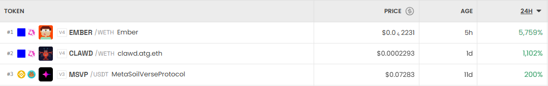 가장 크게 오른 거래쌍은 EMBER/WETH(Ember)이다. 24시간 기준 5759% 급등했다. 이어 CLAWD/WETH(clawd.atg.eth)는 1102% 상승했고, MSVP/USDT(MetaSoilVerseProtocol)는 200% 올랐다.