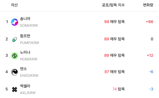 공포·탐욕 지수에서는 솜니아가 98포인트를 기록하며 ‘매우 탐욕’ 구간에 진입했다. 이는 같은 날 집계된 종목 가운데 가장 높은 수치로, 단기적으로 매수 심리가 크게 강화된 흐름을 보여준다. 탐욕 높은 순위에는 펌프펀(PUMP), 노미나(NOM), 엔소(ENSO), 엑셀라(AXL) 등이 뒤를 이었다.