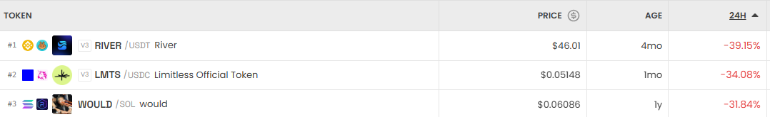 반면 가장 크게 하락한 거래쌍은 리버(RIVER/USDT)로 24시간 기준 -39.15%를 기록했다. 리미트리스 오피셜 토큰(LMTS/USDC) 역시 -34.08% 하락했고, 우드(WOULD/SOL)는 -31.84%로 약세를 보였다.