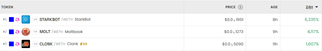 가장 크게 오른 거래쌍은 스타크봇(STARKBOT/WETH)이다. 24시간 기준 6,335% 급등했다. 이어 몰트북(MOLT/WETH)은 4,117% 상승했고, 클롱크(CLONK/WETH)는 1,607% 올랐다.
