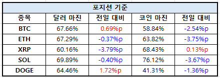 이더리움(ETH)은 달러 마진 기준 67.29%로 전일 대비 0.37%p 하락했고, 코인 마진 역시 63.82%로 3.75%p 줄었다. XRP는 달러 마진 60.16%로 3.79%p 감소한 반면, 코인 마진은 68.43%로 0.13%p 소폭 증가했다.