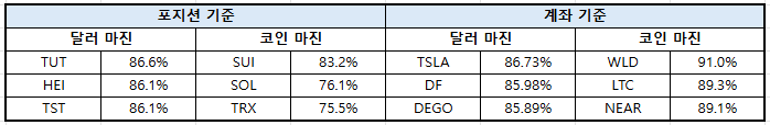 솔라나(SOL)는 달러 마진 기준 84.59%로 2.14%p 상승했으며, 코인 마진 역시 87.37%로 1.53%p 확대됐다. 도지코인(DOGE)은 달러 마진이 76.49%로 0.50%p 줄었지만, 코인 마진은 88.04%로 0.13%p 증가했다.