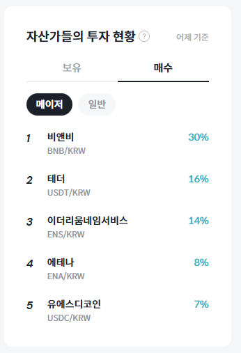 자산가들의 투자 현황에 따르면 어제 기준 빗썸 내 자산 규모 상위 투자자들은 비앤비(BNB)를 30%로 가장 높은 비중으로 매수 포트폴리오에 반영한 것으로 나타났다. 테더(USDT)가 16%로 뒤를 이었으며, 이더리움네임서비스(ENS)는 14%를 기록했다. 이어 에테나(ENA)가 8%, 유에스디코인(USDC)이 7%로 집계됐다. 해당 지표는 빗썸에서 자산 규모 상위 5,000명의 순매수 금액 비중을 기준으로 산출된 것으로, 고액 투자자들의 선호 흐름을 보여준다.