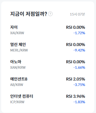 기술적 지표 측면에서는 과매도 신호가 일부 알트코인에서 두드러졌다. 빗썸 기준 오후 3시 7분 기준 자이(XAI), 멀린 체인(MERL), 아노마(XAN)는 RSI 0.00%를 기록하며 극단적인 과매도 구간에 진입했다. 이어 에인션트8(A8)는 RSI 2.05%, 인터넷 컴퓨터(ICP)는 3.96%로 모두 RSI 30 이하의 과매도 구간에 머물렀다.