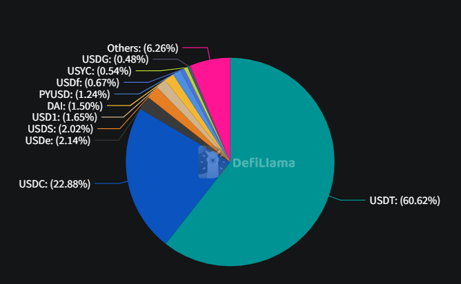스테이블코인 시장 점유율을 보면 1위 테더(USDT)가 1861억9000만 달러(60.62%)로 전체 시장의 절대적 우위를 유지하고 있으며 2위 USD코인(USDC)은 702억9000만 달러(22.88%)로 뒤를 이었다.