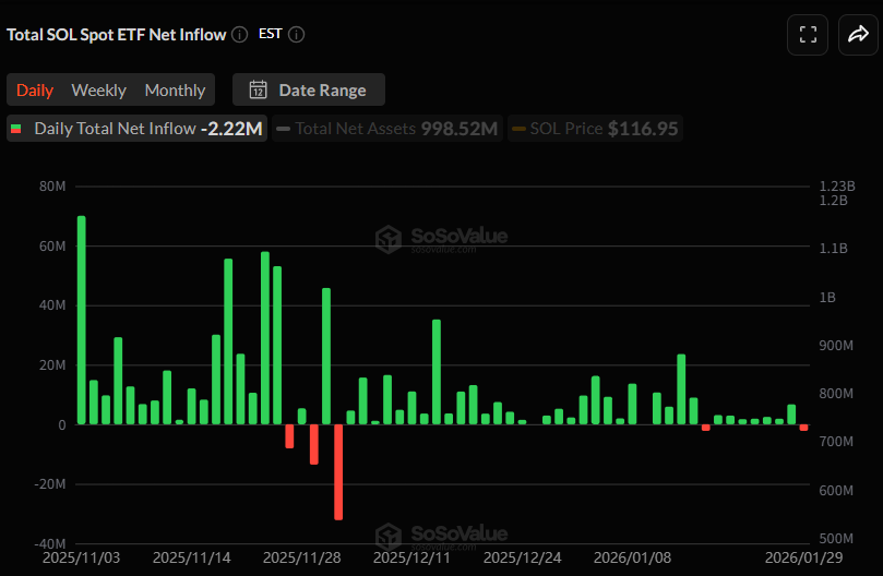 솔라나 현물 ETF 시장은 이날 222만 달러의 일간 순유출을 기록했다.