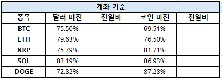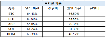 솔라나(SOL)는 달러 마진 61.24%, 코인 마진 81.30%로 집계됐으며, 도지코인(DOGE)은 달러 마진 63.39%, 코인 마진 40.17%를 기록했다.