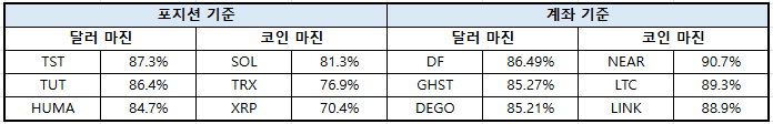 이더리움(ETH)은 달러 마진 기준 63.99%, 코인 마진 65.55%를 기록했다. XRP는 달러 마진 55.65%, 코인 마진 70.36%로 나타났다.