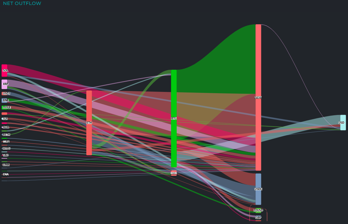 유출 자금의 최종 안착 흐름을 보면 USDT에 총 8억7160만 달러가 집결해 가장 큰 비중을 차지했다. USDC로 1억8840만 달러, FDUSD로 2970만 달러가 각각 안착했다. 법정화폐 중에서는 달러화(USD) 9290만 달러, 원화(KRW) 3150만 달러의 현금화가 이뤄졌다.