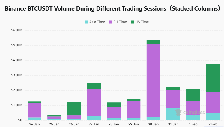 바이낸스 BTCUSDT 거래량은 아시아 시간대 4억9727만 달러, 유럽 시간대 13억9000만 달러, 미국 시간대 18억7000만 달러로 집계됐다.