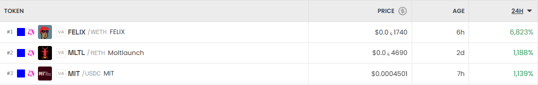 가장 크게 오른 거래쌍은 펠릭스(FELIX/WETH)다. 24시간 기준 6,823% 급등했다. 이어 몰트런치(MTLT/WETH)는 1,188% 상승했고, 미트(MIT/USDC)는 1,139% 올랐다.