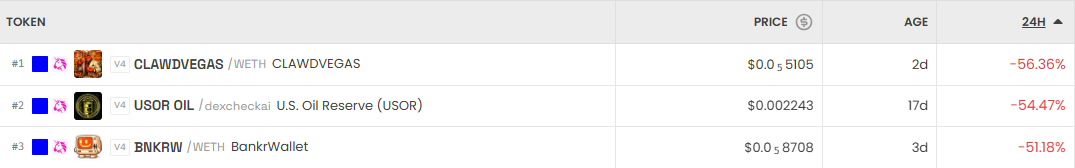 반면 가장 크게 하락한 거래쌍은 클로드베가스(CLAWDVEGAS/WETH)로 24시간 기준 -56.36%를 기록했다. 유에스 오일 리저브(USOR/USD) 역시 -54.47% 하락했고, 뱅커월렛(BNKRW/WETH)은 -51.8%로 약세를 보였다.
