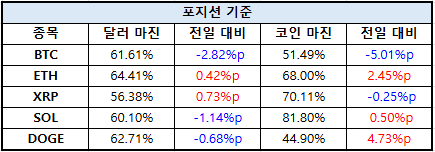 이더리움(ETH)은 달러 마진 기준 64.41%로 전일 대비 0.42%p 상승했고, 코인 마진은 68.00%로 전일 대비 2.45%p 증가했다. XRP는 달러 마진 56.38%로 전일 대비 0.73%p 상승한 반면, 코인 마진은 70.11%로 전일 대비 0.25%p 하락했다.