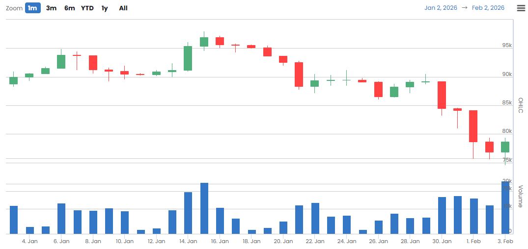 1월 27일 –0.149%에서 28일 –0.154%까지 추가 하락한 이후 29일 –0.162%로 저점을 형성했다. 이후 30일 –0.177%까지 약세가 이어졌으나 31일 –0.118%로 반등했고 2월 1일 –0.094%, 2일 –0.09%로 개선 흐름이 이어졌다. 다만 지표는 여전히 마이너스 구간에 머물러 있어 미국 거래소를 중심으로 한 현물 매수 수요가 본격적으로 회복됐다고 보기는 어려운 상황을 시사하고 있다.