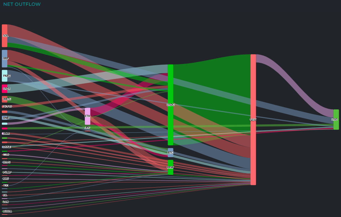 금 연동 자산인 PAXG에서는 1980만 달러가 USDT로 전환됐다. 또한 이더리움(ETH)에서도 2880만 달러 규모의 유출이 나타났으며, 이 가운데 USDC로 1380만 달러, 원화로 1110만 달러, BTC로 390만 달러가 각각 이동했다.