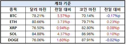 솔라나(SOL)는 달러 마진 기준 84.88%로 전일 대비 4.37%p 상승했고, 코인 마진은 86.96%로 전일 대비 0.10%p 증가했다. 도지코인(DOGE)은 달러 마진 76.06%로 전일 대비 1.60%p 상승한 반면, 코인 마진은 87.91%로 전일 대비 0.02%p 소폭 하락했다.