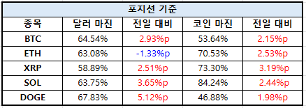 이더리움(ETH)은 달러 마진 기준 63.08%로 전일 대비 1.33%p 하락했고, 코인 마진은 70.53%로 전일 대비 2.53%p 상승했다. XRP는 달러 마진 58.89%로 전일 대비 2.51%p 상승했으며, 코인 마진 역시 73.30%로 전일 대비 3.19%p 증가했다.