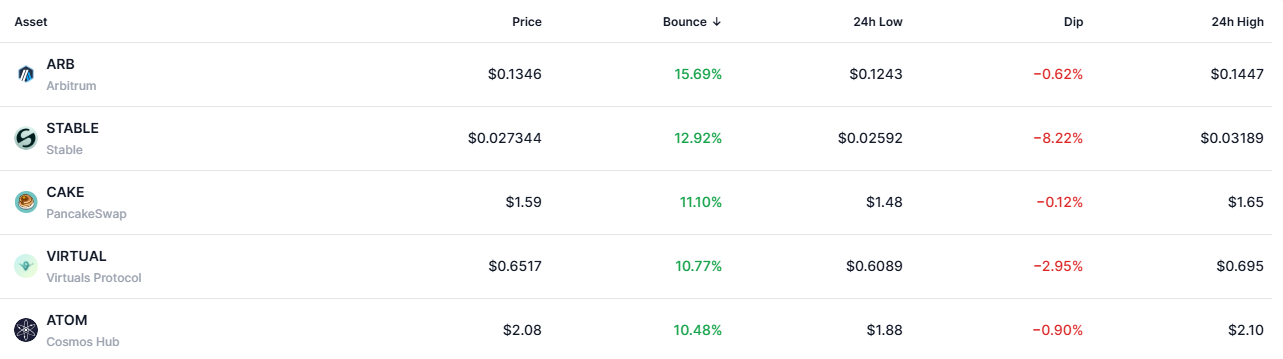 [편집자주] 급락 이후의 되돌림 흐름은 단기 매수세 유입 여부를 가늠하는 하나의 힌트가 될 수 있다. '저점(Dip)'은 최근 7일 최저가를, '반등(Bounce)'은 해당 저점 대비 상승률을 뜻한다. 이를 통해 기술적 반등 흐름과 시장의 수요 반응을 함께 살펴볼 수 있다. 조정 구간 이후 가격이 눈에 띄게 회복된 종목은 다음 추세 전환 가능성을 시사할 수도 있다. 반복적으로 나타나는 가격 패턴을 바탕으로 반등 흐름이 감지되는 자산을 소개한다.