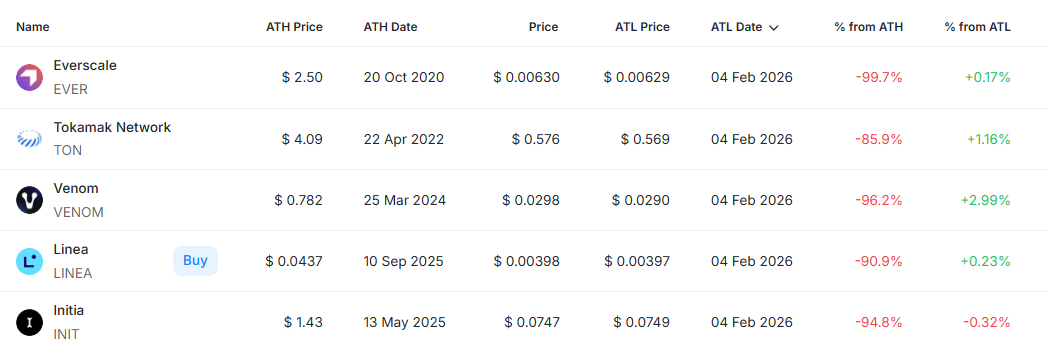 19개 종목이 최저점을 찍었다. 상단 종목들은 대부분 사상 최저가 인근에서 거래되며 극도로 위축된 가격대를 형성하고 있다. 일부 종목은 신저점 형성 이후 소폭 반등을 시도하고 있으나, 회복 탄력은 제한적인 모습이다. 특히 인프라·레이어 관련 토큰 전반에서 매도 압력이 지속되며 투자 심리가 위축된 흐름이 뚜렷하다.