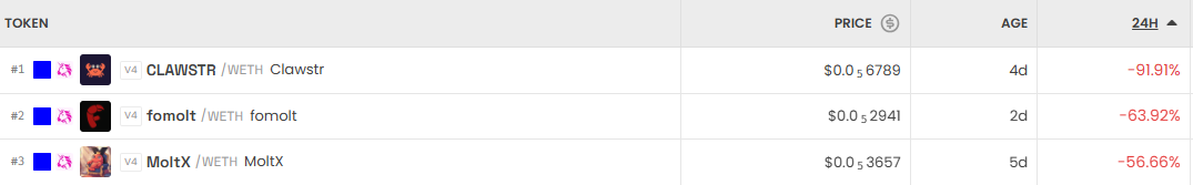 반면 가장 크게 하락한 거래쌍은 클로스트르(CLAWSTR/WETH)로 24시간 기준 -91.91%를 기록했다. 포몰트(fomolt/WETH) 역시 -63.92% 하락했고, 몰트엑스(MoltX/WETH)는 -56.66%로 약세를 보였다.