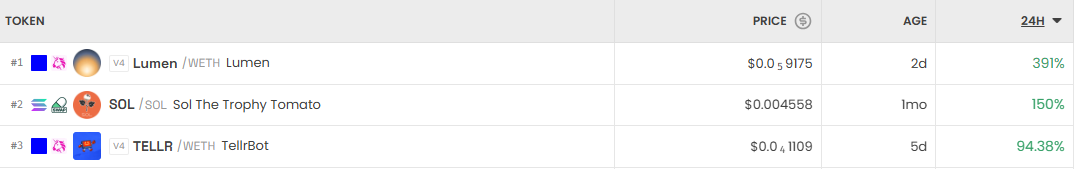 가장 크게 오른 거래쌍은 루멘(Lumen/WETH)이다. 24시간 기준 391% 급등했다. 이어 솔 더 트로피 토마토(SOL The Trophy Tomato/SOL)는 150% 상승했고, 텔러봇(TELLR/WETH)은 94.38% 올랐다.