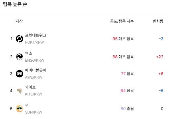 공포·탐욕 지수 상위 종목으로는 엔소(ENSO)에 이어 포켓네트워크(POKT), 에이더블유이(AWE), 카이트(KITE), 썬(SUN) 등이 이름을 올렸다. 같은 시각 주요 가상자산은 대부분 하락세를 보였다. 비트코인(BTC)은 1억 511만 2천 원으로 전일 대비 2.55% 하락했다. 이더리움(ETH)은 313만 원으로 1.26% 하락했다. 리플(XRP)은 2,074원으로 7.08% 하락했다. 솔라나(SOL)는 13만 5천500원으로 0.29% 하락했다.