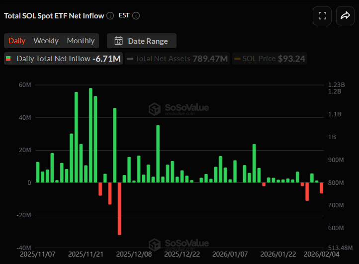 솔라나 현물 ETF 시장은 671만 달러의 일간 순유출을 기록했다. 지난 2일(558만 달러)과 3일(124만 달러)까지 2거래일 연속 순유입 이후 다시 유출세로 전환된 모습이다.