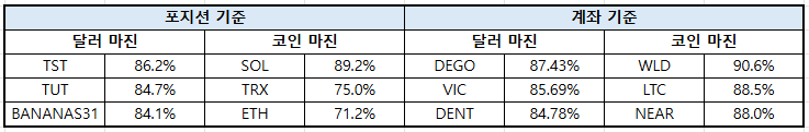 이더리움(ETH)은 달러 마진 기준 62.77%로 전일 대비 1.43%p 상승했고, 코인 마진은 71.19%로 전일 대비 0.75%p 증가했다. XRP는 달러 마진 45.72%로 전일 대비 13.38%p 하락했으며, 코인 마진은 65.61%로 전일 대비 2.25%p 감소했다.