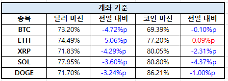 솔라나(SOL)는 달러 마진 기준 77.95%로 전일 대비 3.60%p 하락했으며, 코인 마진은 80.80%로 전일 대비 4.37%p 줄었다. 도지코인(DOGE)은 달러 마진 71.70%로 전일 대비 3.24%p 하락했고, 코인 마진은 86.21%로 전일 대비 1.00%p 감소했다.