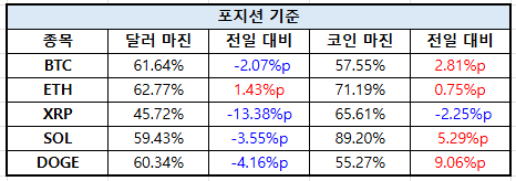 포지션 기준에서 비트코인(BTC)의 롱 포지션 비중은 달러 마진 61.64%로 전일 대비 2.07%p 하락했으며, 코인 마진은 57.55%로 전일 대비 2.81%p 증가했다.