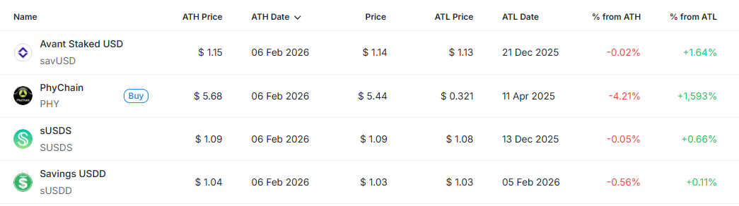 이날 총 4개 종목이 신고점을 경신하거나 사상 최고가 부근에서 거래됐다. 해당 종목들은 대부분 스테이킹·저축형 스테이블코인 또는 이에 준하는 구조로, 가격 변동성이 극히 제한된 상태에서 점진적인 고점 갱신 흐름이 나타나고 있다. 시장 전반의 변동성이 확대되는 국면에서도 이들 자산에는 안정적인 자금 유입이 이어지며, 단기 투기보다는 현금성·대기 자금 성격의 수요가 집중되는 흐름으로 해석된다.
