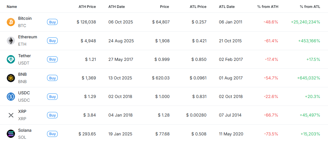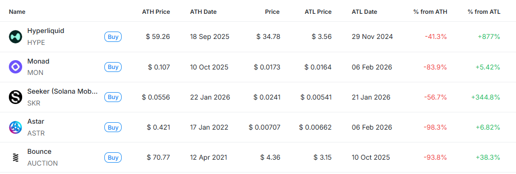 [편집자주] 암호화폐 시장은 하루 새 고점과 저점이 빠르게 바뀌는 고변동성 환경이다. 역대 최고가(ATH)와 역대 최저가(ATL) 경신 종목을 추적하면 강세와 약세 흐름을 조기에 포착할 수 있다. 크립토랭크 기준 시가총액 1000만 달러 이상 종목 중 하루 사이 고점 또는 저점을 경신한 주요 토큰을 정리하고 시가총액 상위 종목과 실시간 국내 인기 자산의 고점 대비 조정률을 함께 분석해 시장 회복 여력과 흐름을 진단한다.
