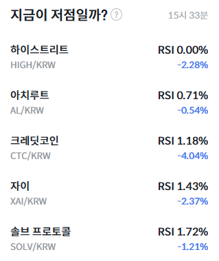 기술적 지표 측면에서는 과매도 신호가 일부 알트코인에서 두드러졌다. 빗썸 기준 오후 3시 33분 기준 하이스트리트(HIGH)는 RSI 0.00%를 기록하며 극단적인 과매도 구간에 진입했다. 아치루트(AL)은 RSI 0.71%, 크레딧코인(CTC)은 1.18%, 자이(XAI)는 1.43%, 솔브 프로토콜(SOLV)은 1.72%로 모두 RSI 30 이하의 과매도 구간에 머물렀다.
