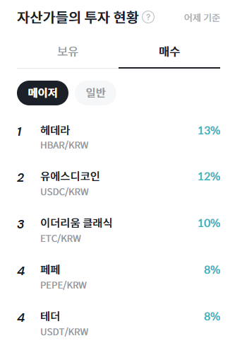 자산가들의 투자 현황에 따르면 어제 기준 빗썸 내 자산 규모 상위 투자자들은 헤데라(HBAR)를 13%로 가장 높은 비중으로 매수한 것으로 나타났다. 이어 유에스디코인(USDC)이 12%, 이더리움 클래식(ETC)이 10%를 기록했으며, 페페(PEPE)와 테더(USDT)는 각각 8%로 공동 4위에 올랐다. 해당 지표는 빗썸에서 자산 규모 상위 투자자들의 순매수 금액 비중을 기준으로 산출된 것으로, 변동성 국면 속에서도 상대적으로 인지도가 높은 자산 중심의 자금 유입이 이어지고 있음을 보여준다.