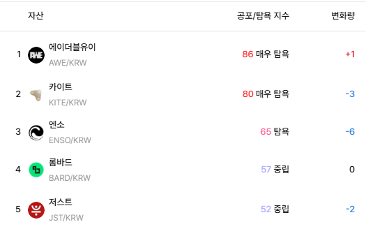 공포·탐욕 지표에서도 AWE는 상위권에 이름을 올렸다. AWE는 공포·탐욕지수 86포인트로 ‘매우 탐욕’ 구간에 위치했으며, 카이트(KITE·80), 엔소(ENSO·65), 룸바드(BARD·57) 등이 뒤를 이었다. 일부 종목을 중심으로 투자 심리가 빠르게 개선되며 종목별 온도 차가 나타나는 모습이다.