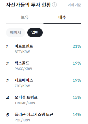 자산가들의 투자 현황에 따르면 어제 기준 빗썸 내 자산 규모 상위 투자자들은 비트토렌트(BTT)를 21%로 가장 높은 비중으로 매수한 것으로 나타났다. 이어 팍스골드(PAXG)와 제로베이스(ZBT)가 각각 19%로 공동 2위에 올랐으며, 오피셜 트럼프(TRUMP)는 15%, 폴리곤 에코시스템 토큰(POL)은 14%를 기록했다. 해당 지표는 빗썸에서 자산 규모 상위 투자자들의 순매수 금액 비중을 기준으로 산출된 것으로, 일부 테마형·대체 자산을 중심으로 한 선별적 접근이 이어지고 있음을 보여준다.