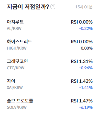 기술적 지표 측면에서는 과매도 신호가 일부 알트코인에서 두드러졌다. 빗썸 기준 오후 3시 1분 기준 아치루트(AL)와 하이스트리트(HIGH)는 RSI 0.00%를 기록하며 극단적인 과매도 구간에 진입했다. 크레딧코인(CTC)은 RSI 1.31%, 자이(XAI)는 1.42%, 솔브 프로토콜(SOLV)은 1.47%로 모두 RSI 30 이하의 과매도 구간에 머물렀다.