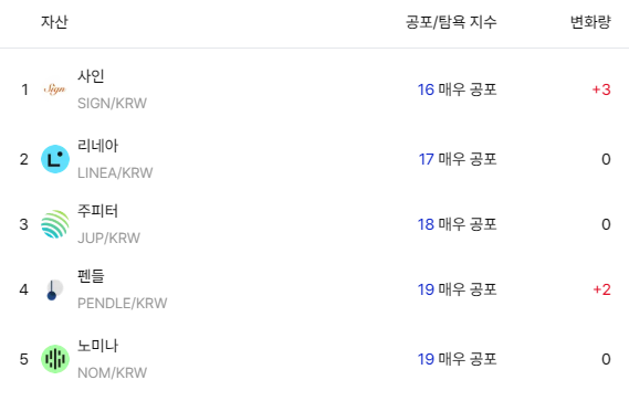 공포·탐욕 지표에서도 사인은 가장 낮은 수준을 나타냈다. 사인은 공포·탐욕지수 16포인트로 ‘매우 공포’ 구간에 위치했으며, 리니아(LINEA·17), 주피터(JUP·18), 펜들(PENDLE·19), 노미나(NOM·19) 등이 뒤를 이었다. 최근 일부 종목의 단기 반등과 대비되는 흐름으로, 종목별 투자 심리의 온도 차가 뚜렷하게 나타나고 있다.