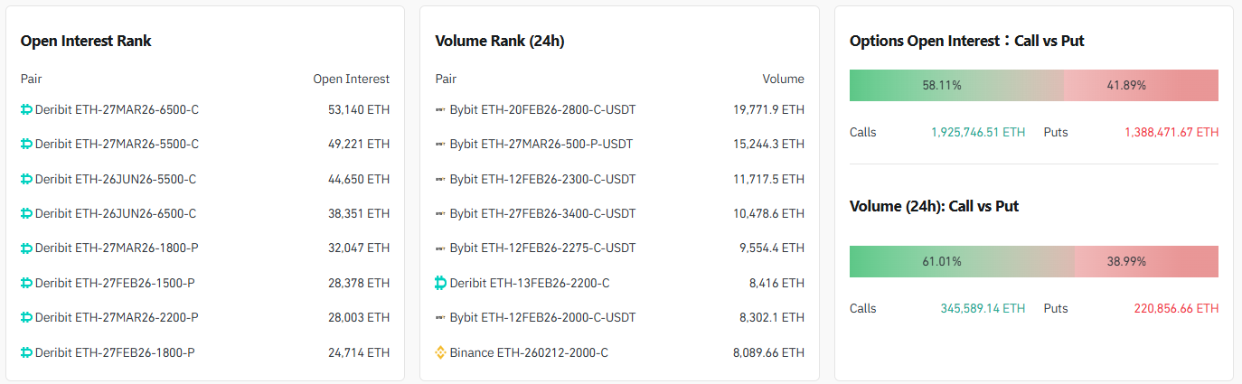 24시간 거래량 기준 상위 계약은 ▲2800달러 콜옵션(2월 20일·바이비트) ▲500달러 풋옵션(3월 27일·바이비트) ▲2300달러 콜옵션(2월 12일·바이비트) 순으로 나타났다.