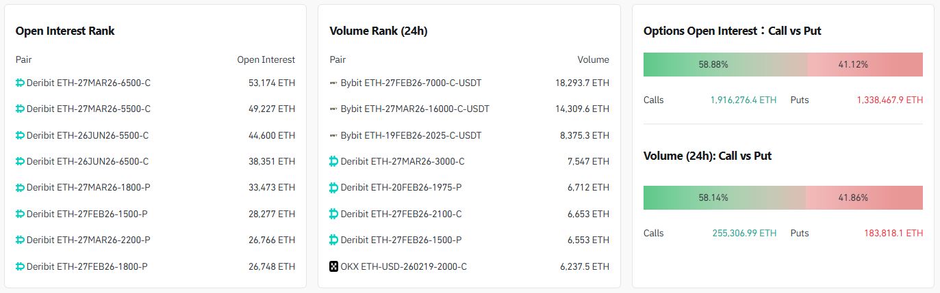 24시간 거래량 기준 상위 계약은 ▲7000달러 콜옵션(2월 27일·바이비트) ▲16000달러 콜옵션(3월 27일·바이비트) ▲2025달러 콜옵션(2월 19일·바이비트) 순으로 나타났다.