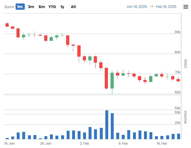 앞서 2월 15일에는 +253BTC로 순입금이 나타났으나 16일 –612BTC, 17일 –768BTC로 순유출이 확대됐다. 18일에는 +238BTC로 반등했지만 19일 –146BTC로 다시 유출 전환됐다. 단기 자금 이동이 반복되며 포지션 조정과 보관 수요가 혼재된 흐름을 보이고 있다.